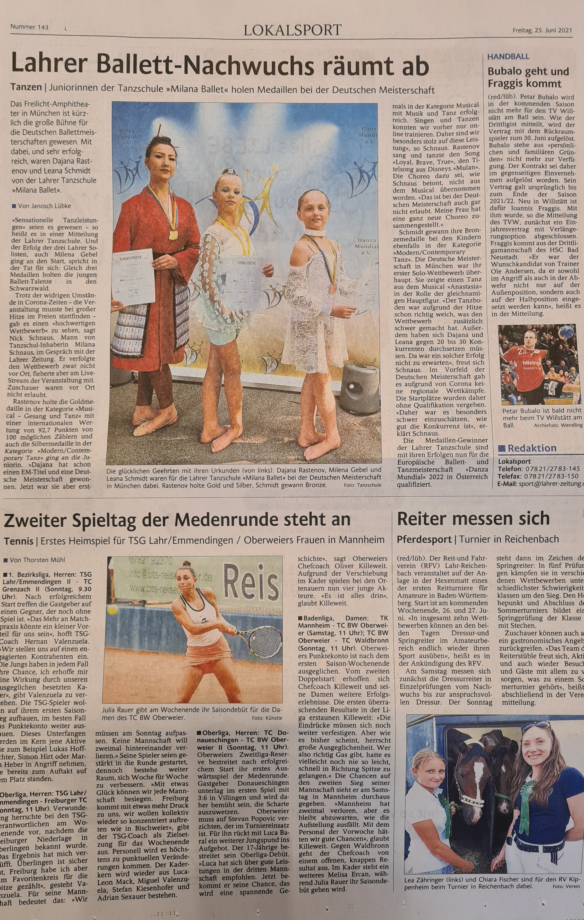 *** (Juni.21)UNGLAUBLICH! Wir haben bei den Deutschen Ballettmeisterschaften 2021 in München das Medaillen Triple aus GOLD, SILBER & BRONZE geholt! Somit sind wir vertreten im Team Deutschland bei den Europäischen Ballett- & Tanzmeisterschaften "Danza Mundial" 2022 in Österreich. Wir sind mega stolz auf unsere Tanzmädels ;-):