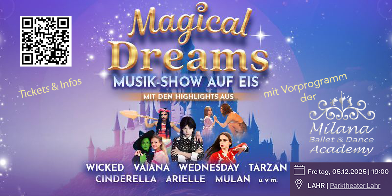 Unser Highlight im Dezember!: Wir sind mit einem 15 minütigen Opening Programm bei der erfolgreichen Show Produktion "MAGICAL DREAMS - Musik Show auf Eis" mit dabei im Parktheater Lahr am: Freitag, 05.12.2025!